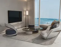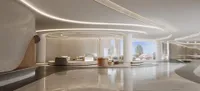 The architecture of Oceano features cadence glass facades and ultra-thin frames, with each floor plate finished with rounded curves to frame panoramic vistas. Terraces cantilever out of the front façade, integrating the outdoors with the living spaces. The interior design emphasizes clean lines and attention to detail, combining luxurious furniture and feature walls with rich textured finishes.